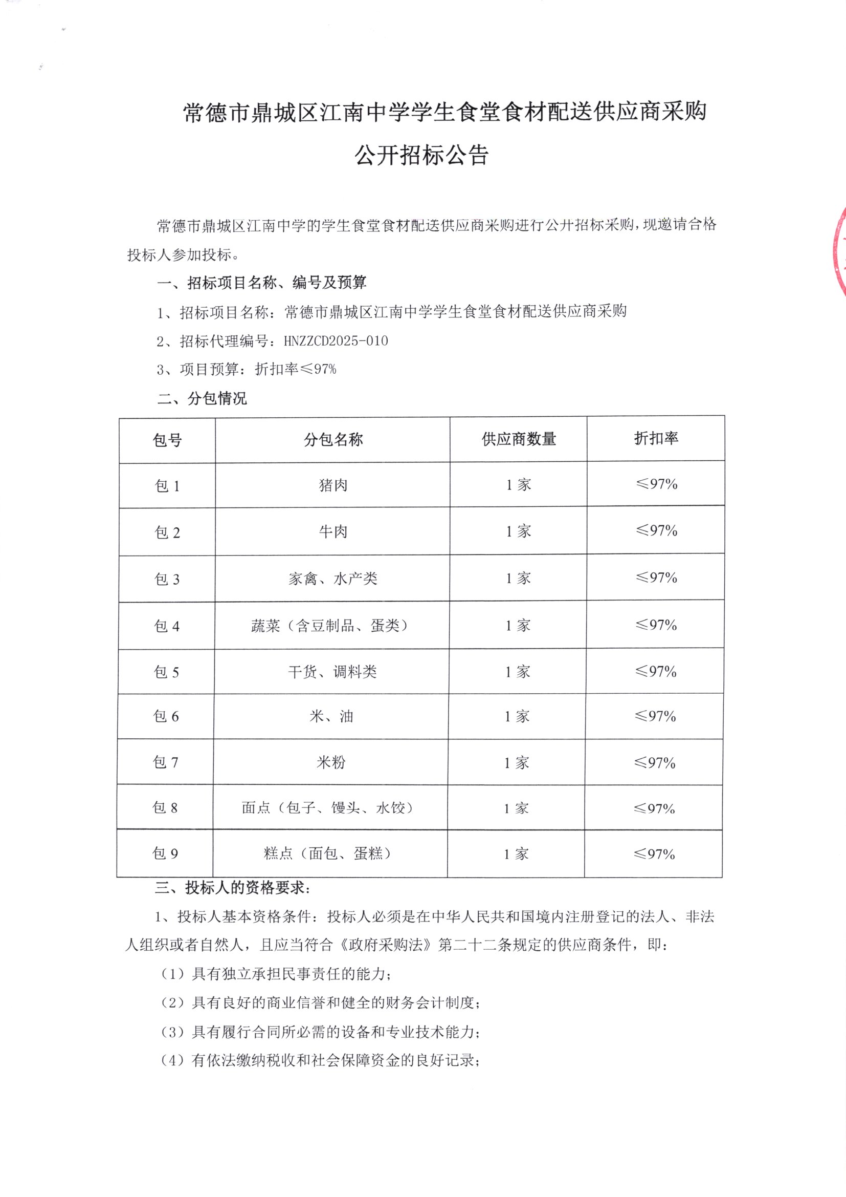 常德市鼎城区江南中学学生食堂食材配送供应商采购公开招标公告